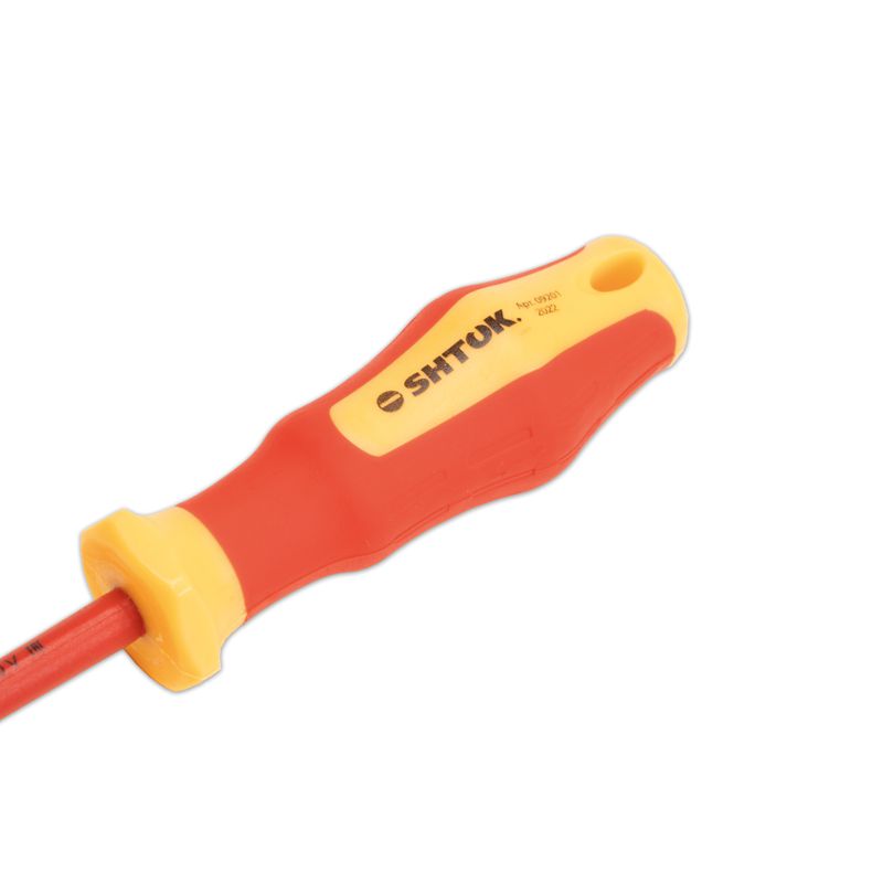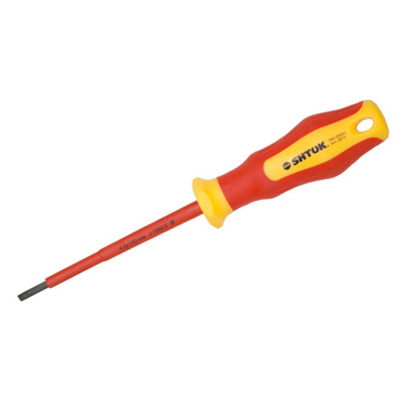 Диэлектрическая шлицевая отвертка SHTOK 1000В 4.0x100 мм 09201 оснащена рукояткой удобной формы, способствующей надежному хвату. Рабочая часть выполнена из хром-ванадиевой стали, увеличивающей прочность и долговечность отвертки. Рабочая часть оснащена магнитным наконечником, повышающим удобство монтажа в приборах, расположенных вертикально. Отвертка предназначена для работ под напряжением.