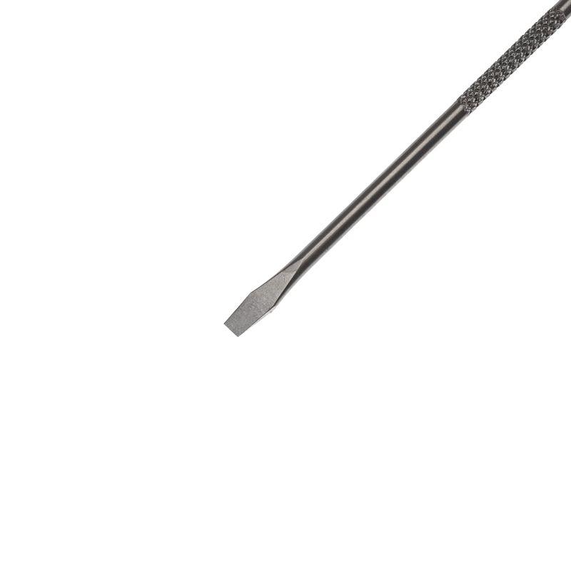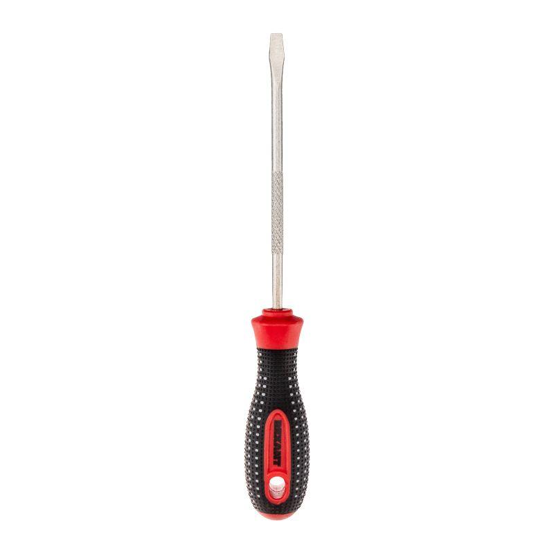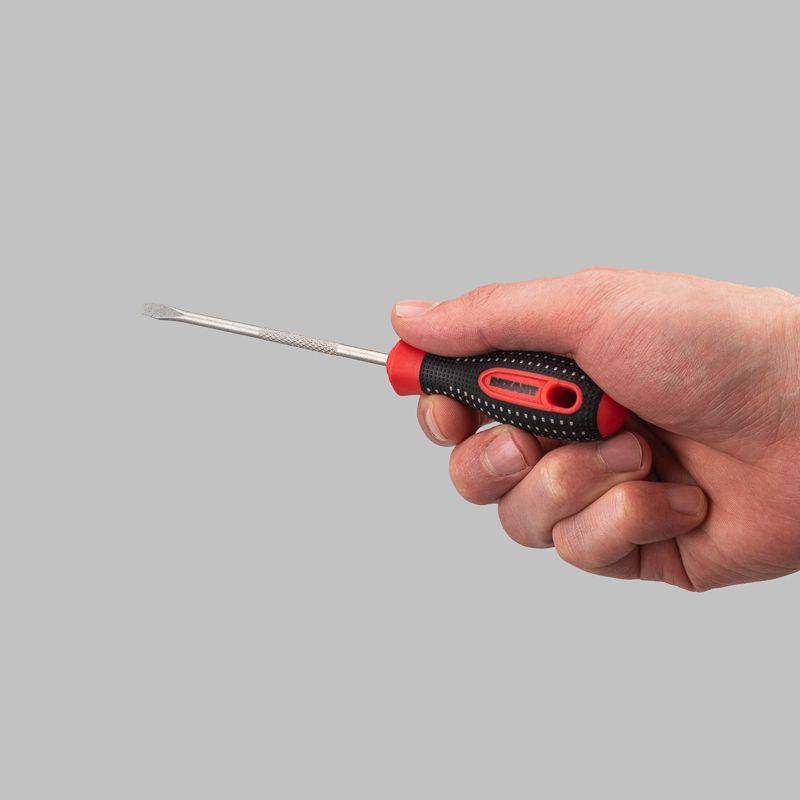 Отвертка шлицевая используется для монтажа и демонтажа резьбовых соединений (шурупов, саморезов), имеющих на головке прямой паз. Оснащена эргономичной трехкомпонентной рукояткой, которая предотвращает скольжение в ладони и обеспечивает более комфортную работу. Инструмент обладает стержнем, который изготовлен из высококачественной японской стали, характеризующейся повышенной прочностью и высокой стойкостью к коррозии. Также на стержне расположены насечки, благодаря которым можно использовать отвертку как надфиль для точных работ.