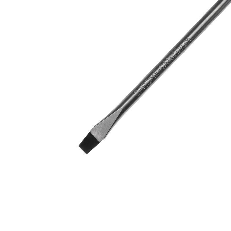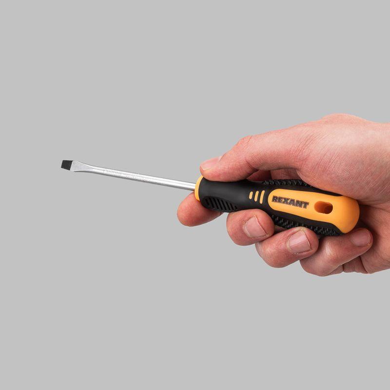 Отвертка SL5х100 мм REXANT используется для монтажа и демонтажа резьбовых соединений (шурупов, саморезов), имеющих на головке прямой паз. Оснащена эргономичной двухкомпонентной прорезиненной рукояткой, которая предотвращает скольжение в ладони и обеспечивает более комфортную работу. Инструмент обладает стержнем, который изготовлен из высококачественной хромованадиевой стали, характеризующейся высокой стойкостью к коррозии. Благодаря намагниченному наконечнику крепежная деталь не упадет при извлечении или установке. В основании инструмента предусмотрено отверстие для его подвеса.