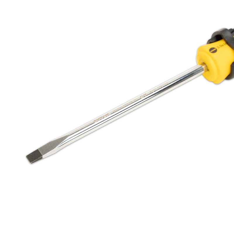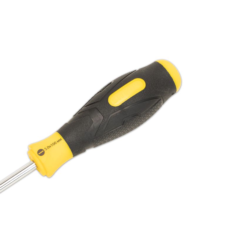 За счет рабочей части, изготовленной из термообработанной стали, содержащей хром-молибден-ванадиевую лигатуру, обеспечивается прочность и долговечность шлицевой отвертки SHTOK 5.0x100 мм 09102.