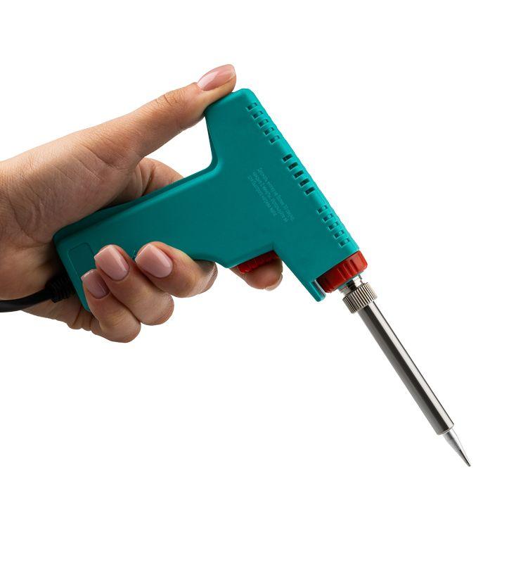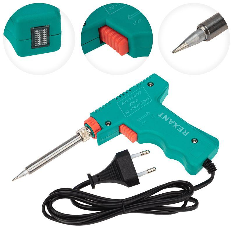 Паяльник-пистолет двухрежимный с керамическим нагревателем серии МАСТЕР мощностью 30/130Вт REXANT предназначен для ручного монтажа/демонтажа электронных компонентов и других мелких и средних деталей. Конструктивные особенности: рукоятка в форме пистолета, возможность осуществлять пайку в двух режимах мощности (30Вт и 130Вт). Максимальная мощность и ускоренный разогрев активируются нажатием и удержанием кнопки, расположенной на рукоятке, что позволяет мастеру сначала установить жало инструмента в определенную точку пайки, а затем перевести паяльник в максимальный рабочий режим. Долговечное жало паяльника состоит из медьсодержащего сердечника, покрытого слоем электролитически осажденного железа, отличающегося высокой стойкостью к коррозии. При соблюдении ряда предосторожностей жало способно работать длительное время без утраты эксплуатационных свойств, а в случае необходимости его можно легко и быстро заменить (сменное жало в комплект не входит). На корпусе расположен индикатор включения. Удобная рукоятка выполнена из термостойкого пластика, что сделает работу с инструментом легкой и приятной.