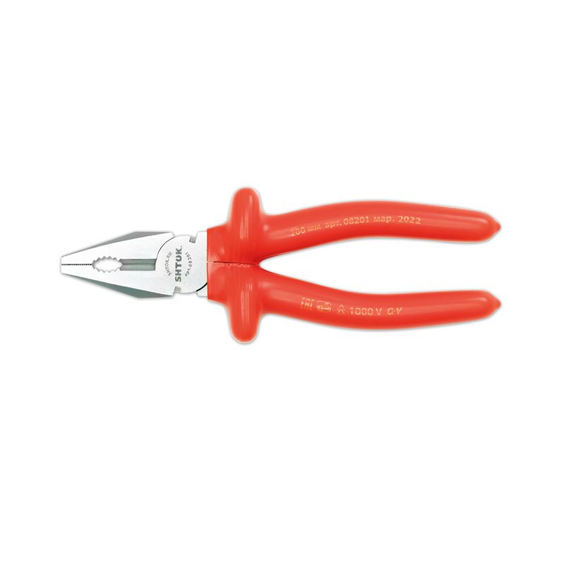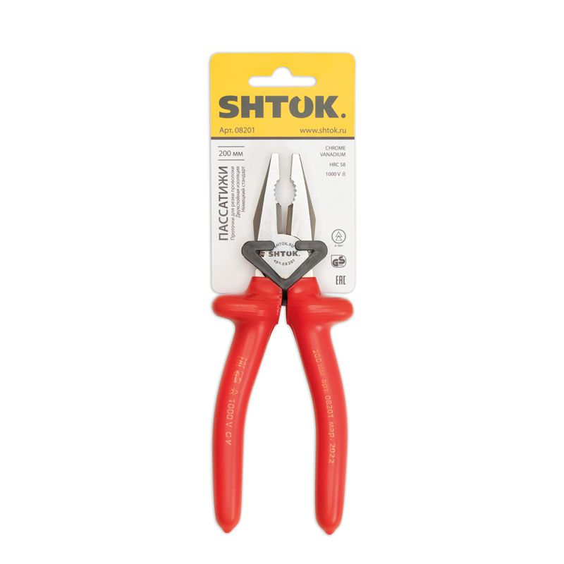 Рабочая часть диэлектрических пассатижей SHTOK 1000В 180 мм 08202, выполненная из хром-ванадиевой стали, увеличивает прочность инструмента.