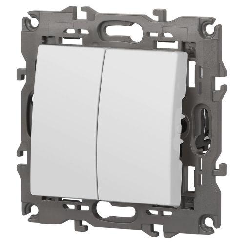 Выключатель 2-клавишный проходной Эра Elegance белый 14-1106-01. Оснащён автоматическими клеммами для надёжной фиксации жил кабеля в механизме. Рамки приобретаются отдельно. Рамки Эра Elegance ПЛАСТИК: 1 пост 14-5001-хх, 2 поста 14-5002-хх, 3 поста 14-5003-хх, 4 поста 14-5004-хх, 5 постов 14-5005-хх; СТЕКЛО: 1 пост 14-5101-хх, 2 поста 14-5102-хх, 3 поста 14-5103-хх, 4 поста 14-5104-хх; МЕТАЛЛ: 1 пост 14-5201-хх, 2 поста 14-5202-хх, 3 поста 14-5203-хх, 4 поста 14-5204-хх; ДЕРЕВО: 1 пост 14-5301-хх, 2 поста 14-5302-хх, 3 поста 14-5303-хх, 4 поста 14-5304-хх (хх - код цвета: 00-прозрачный, 01-белый, белёный дуб, 02-слоновая кость, 03-алюминий, 04-шампань, 05-чёрный, чёрное дерево, 07-ясень, 09-дуб, 10-венге, 11-клён, 14-медь, 21-жёлтый, 22-оранжевый, 23-красный, 25-бордо, 26-лайм, 27-зелёный, 28-голубой, 29-синий, 30-розовый, 31-мокко, 32-серый, 41-сталь, 42-титан).