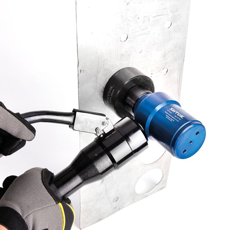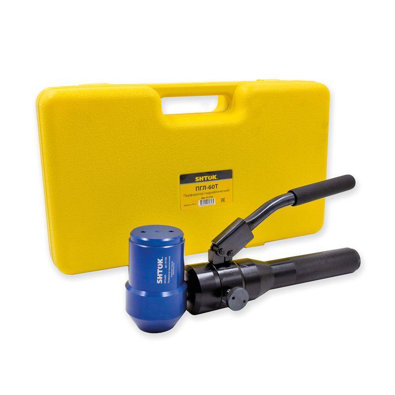 Ручной гидравлический перфоратор для листового металла SHTOK ПГЛ-60Т 01103 обладает облегченной конструкцией для комфортного выполнения монтажных работ. Инструмент имеет вращающуюся рабочую часть для широкого спектра работ. К данной модели можно подобрать более 40 насадок для получения отверстий разных видов и размеров. Пресс-перфоратор используется в автомастерских, на станциях технического обслуживания.
