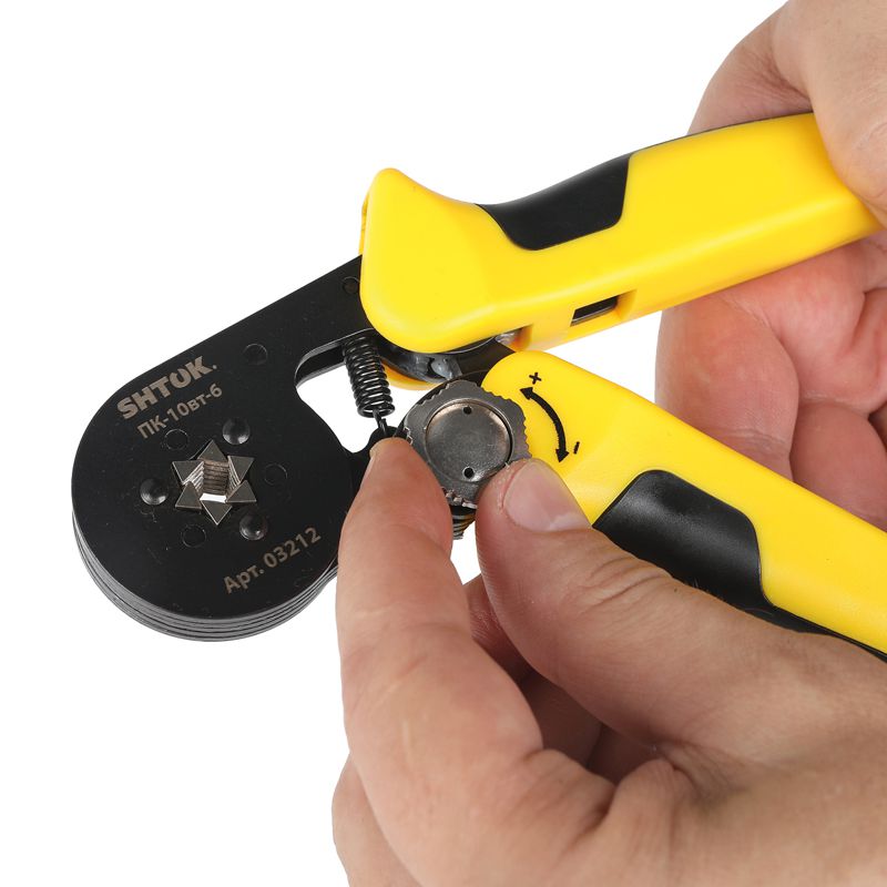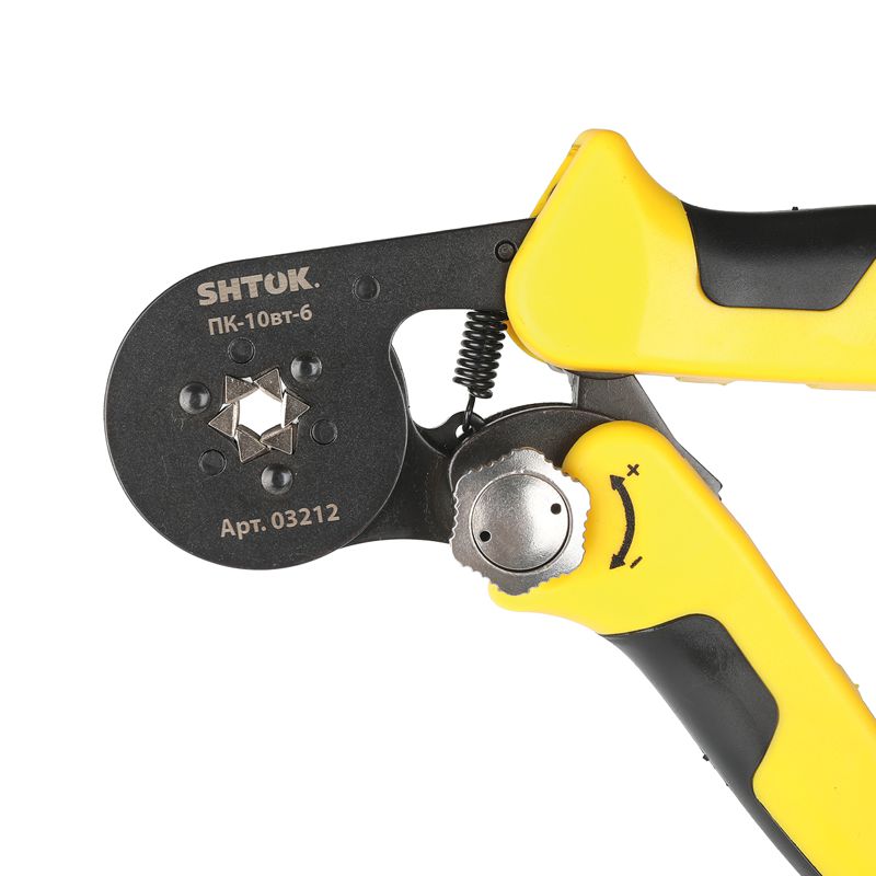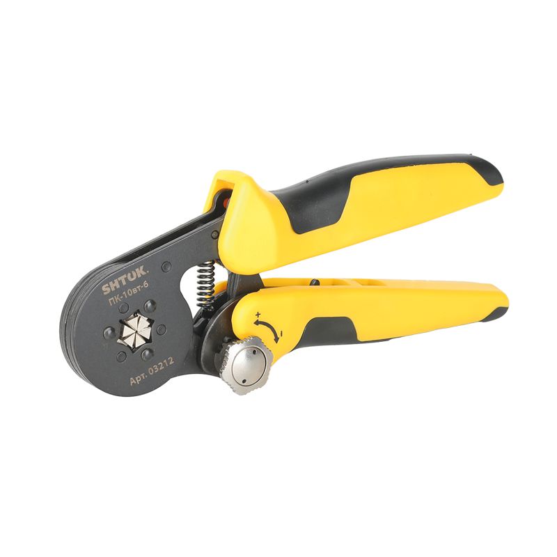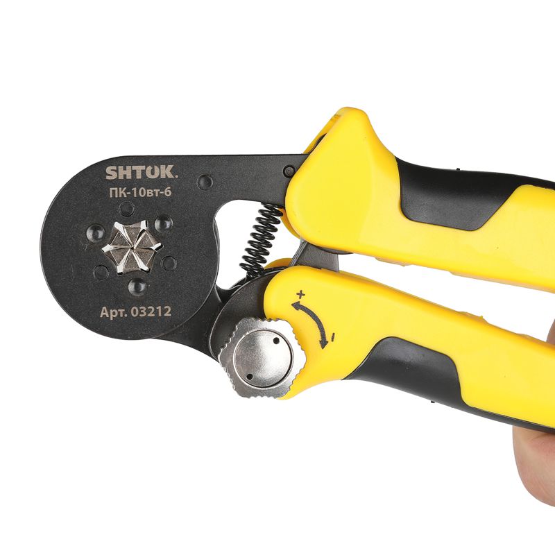 Пресс-клещи для опрессовки втулочных наконечников 0.25-10 мм2 SHTOK ПК-10вт-6 03212 оснащаются храповым механизмом, который автоматически разблокируется по завершении цикла. Двухкомпонентные рукоятки эргономичной формы способствуют удобству эксплуатации. Модель изготавливается из холоднокатанной углеродистой стали, что гарантирует высокую прочность и долговечность. Благодаря наличию специальной кнопки регулировка усилия обжима осуществляется максимально легко без использования вспомогательного инструмента.