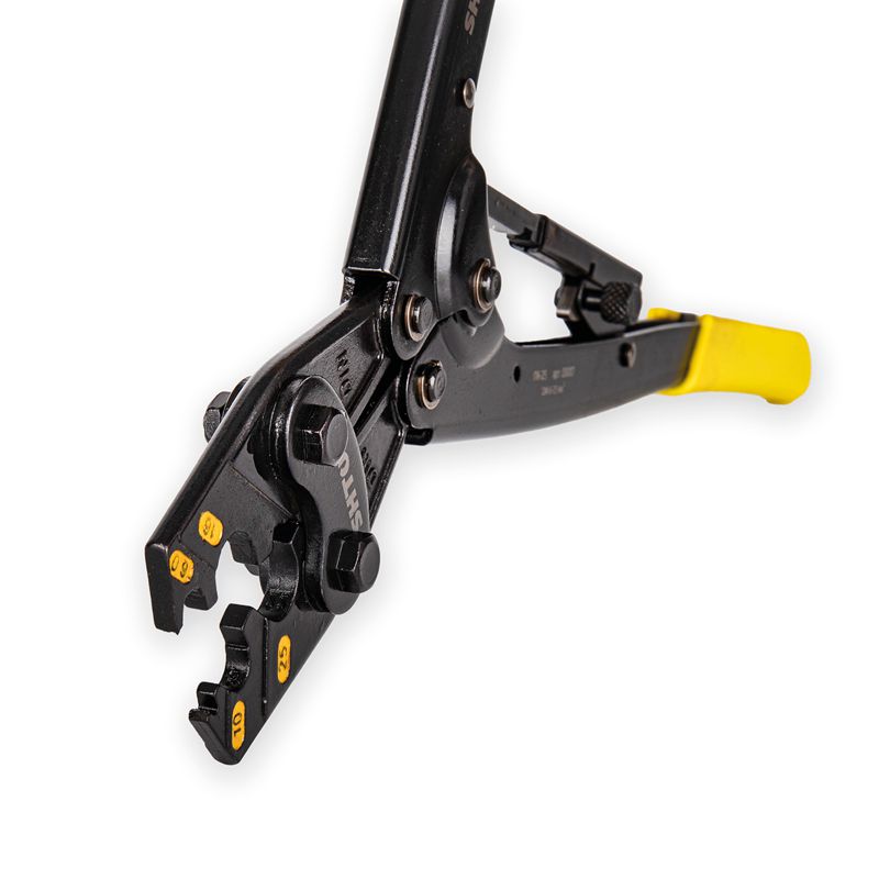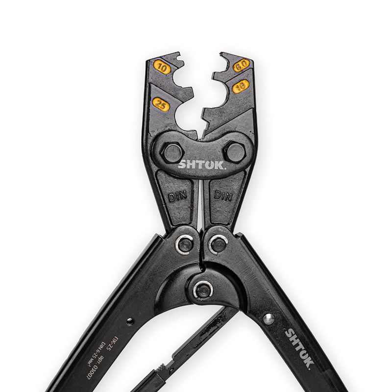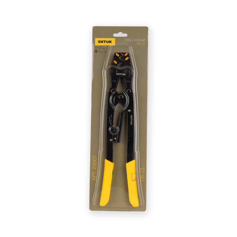 Особая конструкция ручных пресс-клещей SHTOK ПК-25 03007 плотно зажимает кабель, не давая ему ""выйти"" из рабочей области.