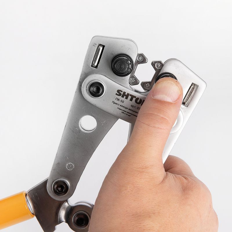 Ручные пресс-клещи SHTOK ПК-50 03005 производят опрессовку одним движением. Легко перенастраиваются на любое сечение. Прочная конструкция обеспечивает надежность и долговечность конструкции. Сечения: 6, 10, 16, 25, 35, 50 мм2.