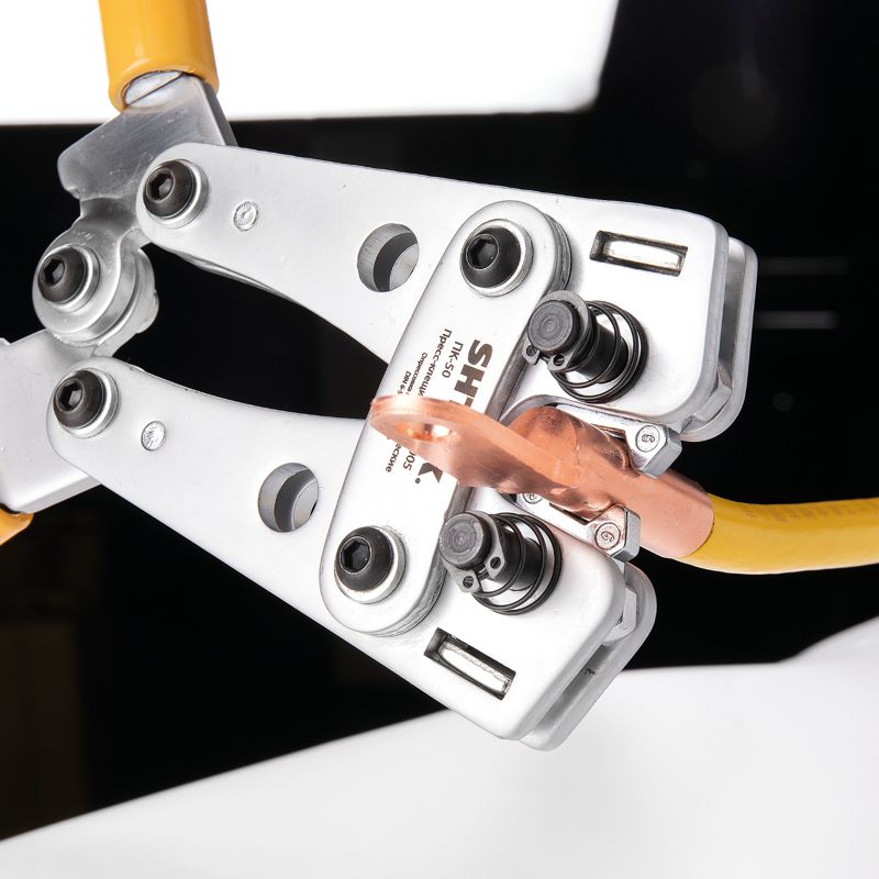 Пресс-клещи с механическим приводом для оконцевания жил с помощью алюминиевых и медных кабельных наконечников. Оконцевание осуществляется переставными матрицами револьверного типа в диапазоне сечений от 6 до 50 мм2.