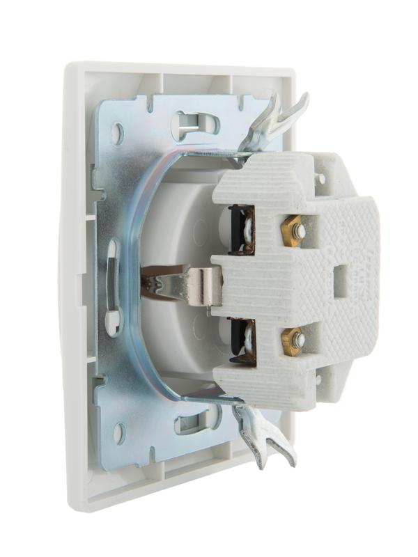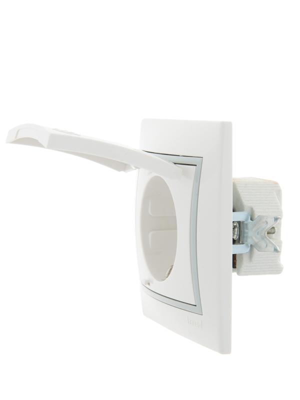 Корпус представляет собой форму из негорючего пластика, белого цвета, с защитными шторками, автоматически закрывающими гнезда розетки при вынутой вилке, и защитной крышеой полупрозрачного серого цвета. Основание керамическое. Подпружиненные лапки крепления обеспечивают комфортный и легкий монтаж изделия. Предусмотрена возможность установки без применения монтажной коробки.
