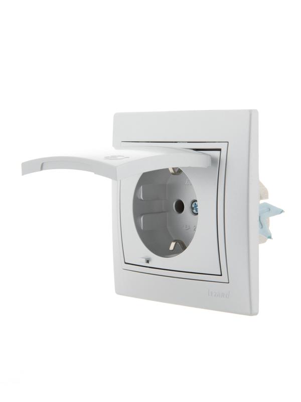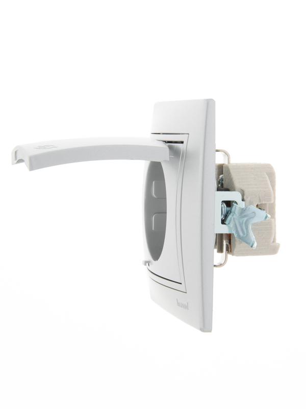 Корпус представляет собой форму из негорючего пластика, белого цвета, с защитными шторками, автоматически закрывающими гнезда розетки при вынутой вилке, и защитной крышеой полупрозрачного серого цвета. Основание керамическое. Подпружиненные лапки крепления обеспечивают комфортный и легкий монтаж изделия. Предусмотрена возможность установки без применения монтажной коробки.