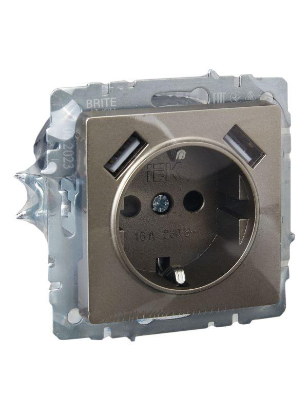 Розетка BRITE РЮш10-2-БрШ 16А с USB A+A 3.1А с заземл. защ. шторки механизм шампань IEK BR-R14-16-U21-D31-K37