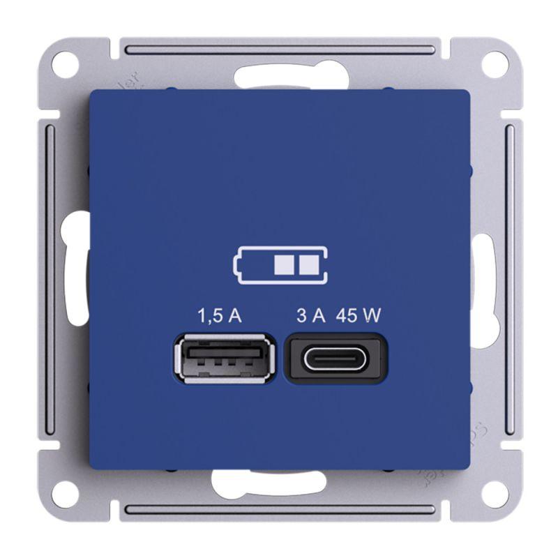Розетка Systeme Electric (ранее Schneider Electric) серии AtlasDesign (цвет аквамарин) двойная USB с разъемами типа A+C высокоскоростная. Самая современная USB-зарядка с двумя разъемами позволяет заряжать как стандартные мобильные устройства через разъем типа А, так и новейшие устройства с разъемом типа С. Позволяет заряжать смартфоны последнего поколения, которые поддерживают функцию быстрой зарядки. Мощность: тип-A – 7.5 Вт, тип-С - 45Вт. Поддерживает современные протоколы быстрой зарядки QC, PD, последних версий. Лицевые детали из качественного ABS-пластика, устойчивого к царапинам и УФ-излучению.