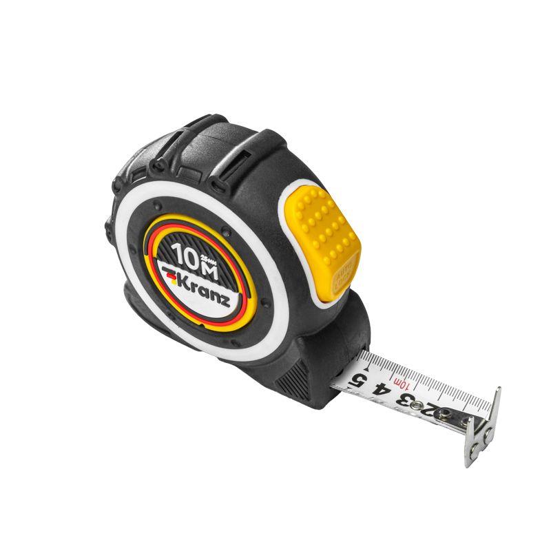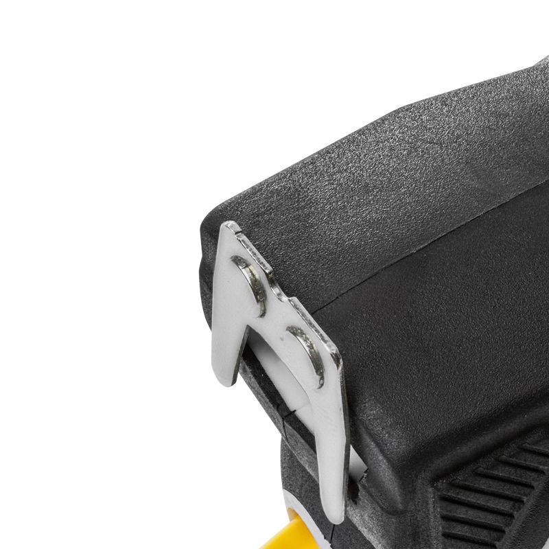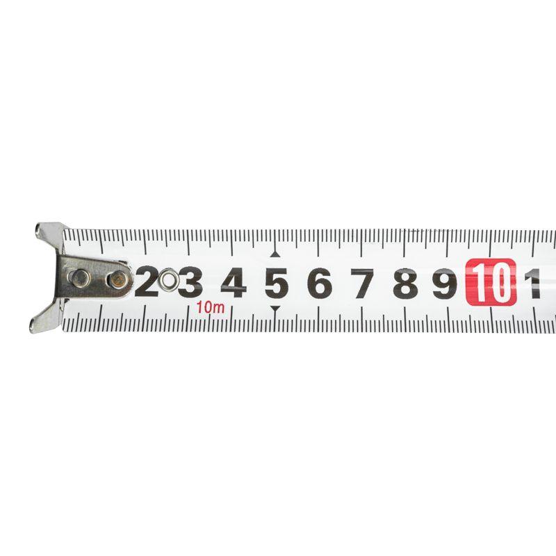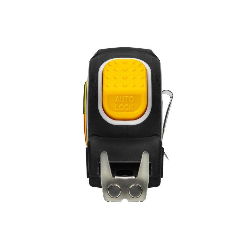 Двухкомпонентный прорезиненный корпус, выполненный из ударопрочного пластика, не скользит в руках. Закаленное двухстороннее толстое полотно может быть вытянуто на большую длину без изломов. Имеет глянцевое лаковое покрытие, которое не стирается со временем. Обладает удобным двухсторонним зацепом с мощными магнитами. Автоматическая лента бесшумно сматывается при нажатии на кнопку.