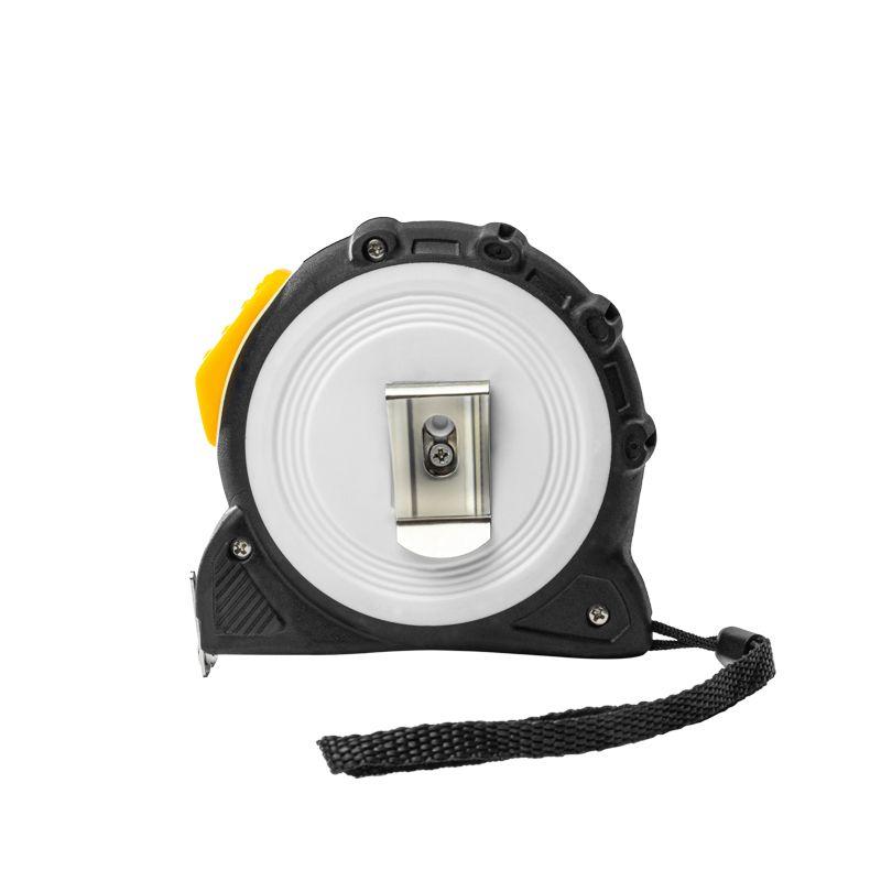 На корпусе расположена клипса-зажим для фиксации рулетки на ремне, кармане или поясной сумке. Ремешок позволяет надевать инструмент на запястье, чтобы освободить руки для работы.