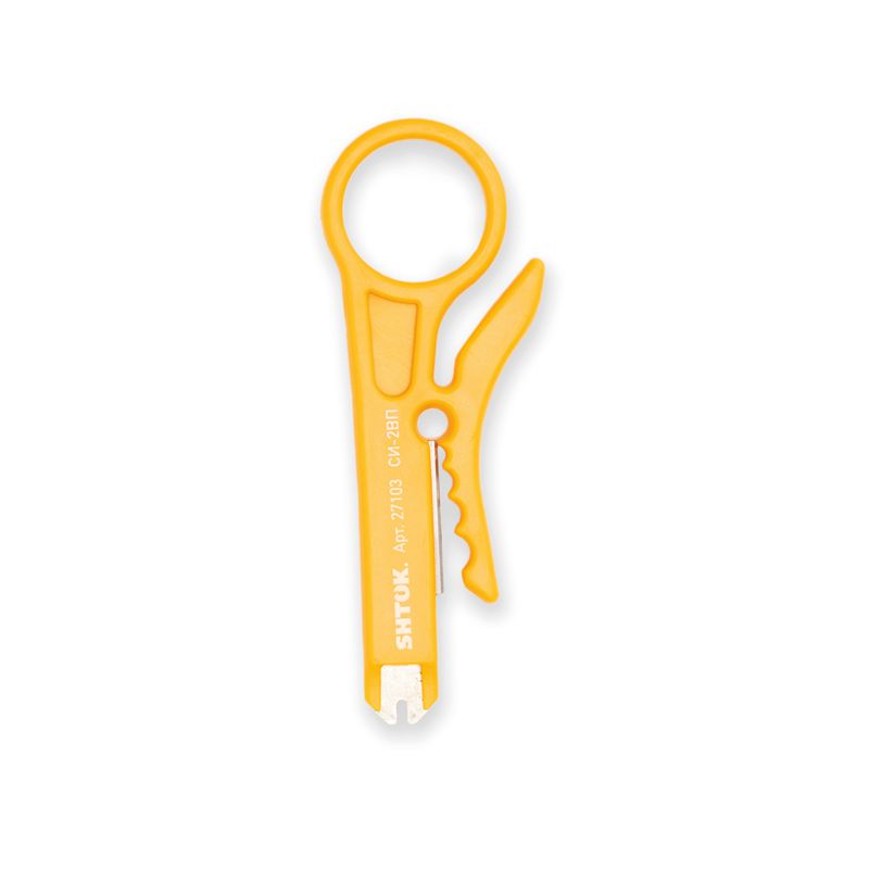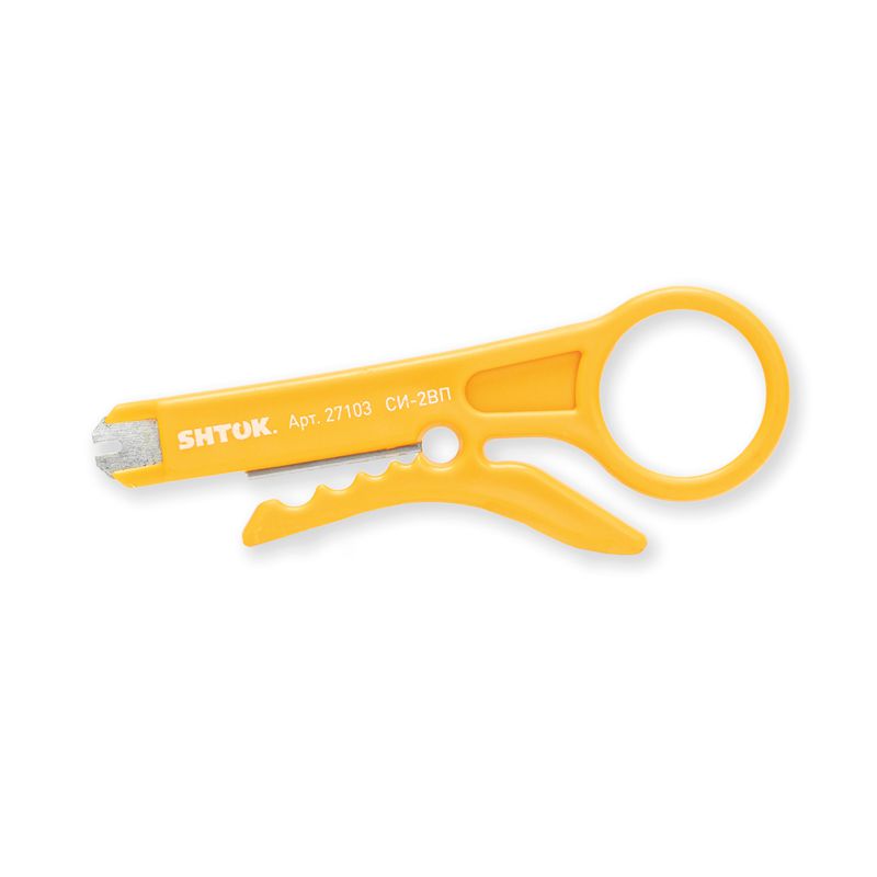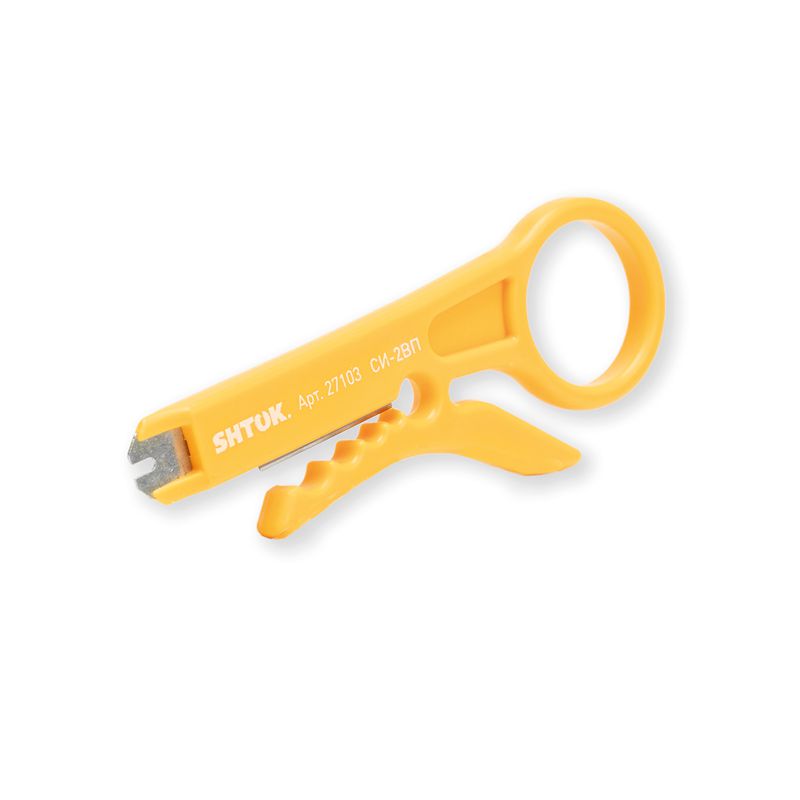 Специальная форма ручки съемника изоляции для кабеля и одиночных проводов с инструментом для разъемов SHTOK СИ-2ВП 27103 обеспечивает удобство в работе."