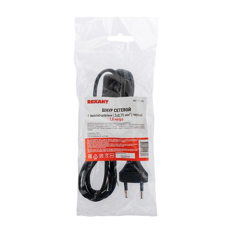 Шнур сетевой 1.8м с выключателем ШВВП 2х0.75 черн. Rexant 11-1134