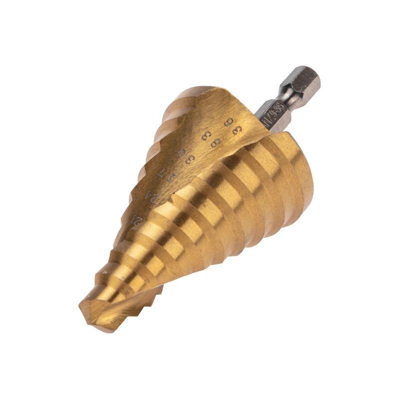 На каждой из 10 ступеней сверла нанесена маркировка фактического диаметра. Диапазон ступеней: 9, 12, 15, 18, 21, 24, 27, 30, 33, 36 (шаг 3 мм).