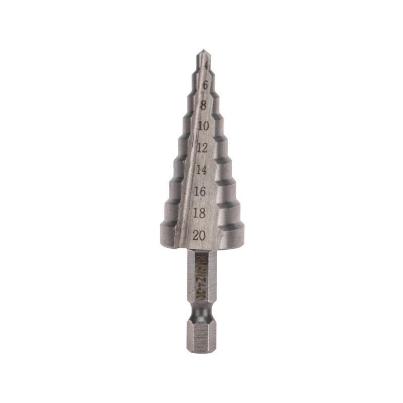 На каждой из 9 ступеней сверла нанесена маркировка фактического диаметра. Диапазон ступеней: 4, 6, 8, 10, 12, 14, 16, 18, 20 (шаг 2 мм).