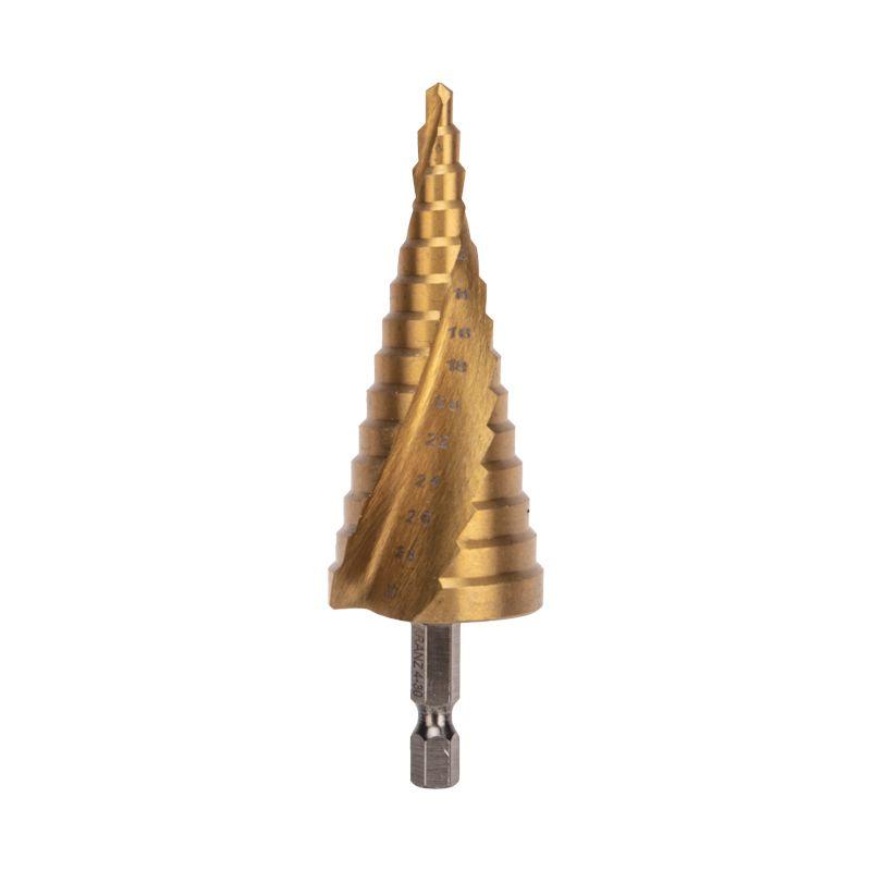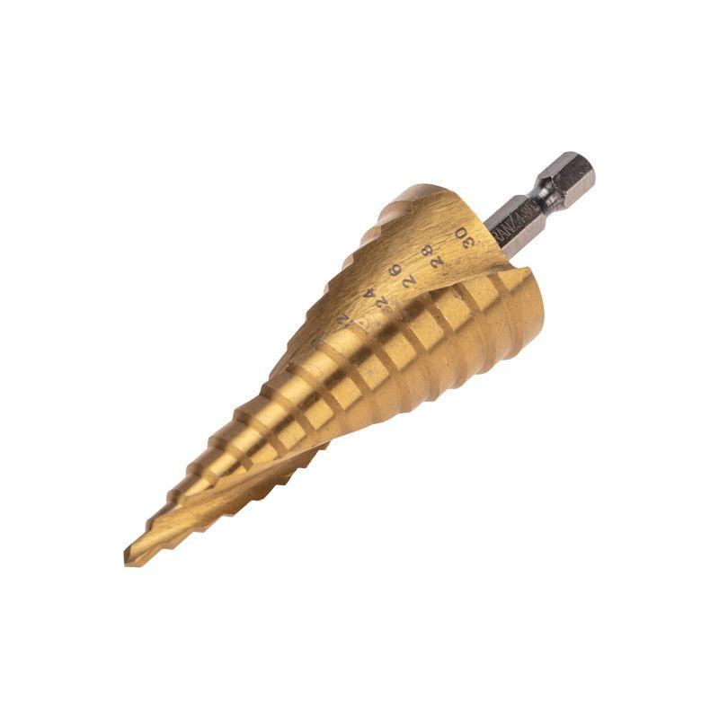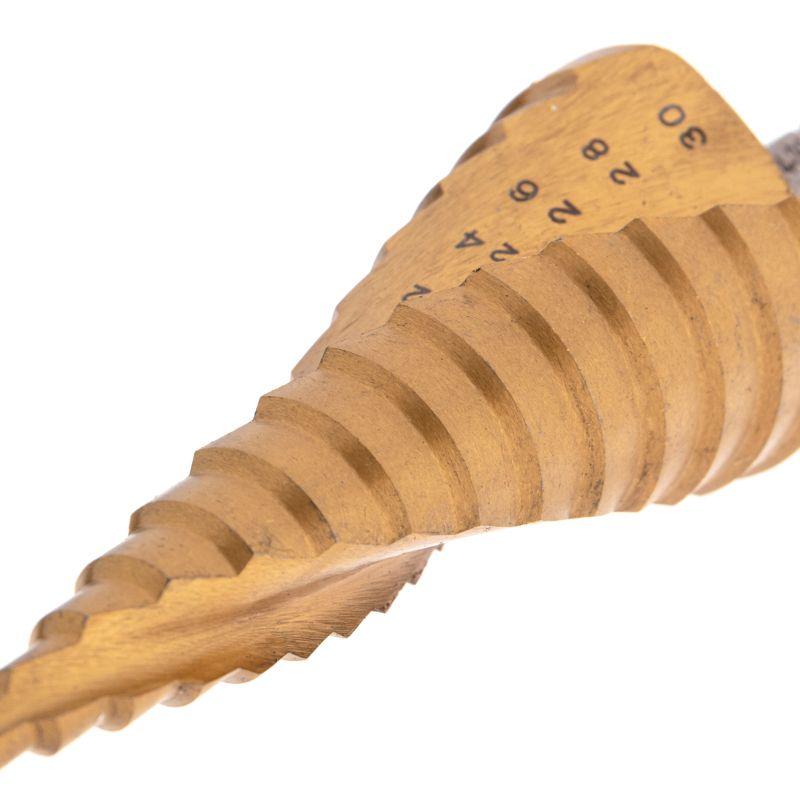 На каждой из 14 ступеней сверла нанесена маркировка фактического диаметра. Диапазон ступеней: 4, 6, 8, 10, 12, 14, 16, 18, 20, 22, 24, 26, 28, 30 (шаг 2 мм).