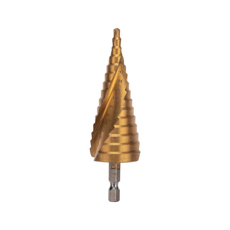 На каждой из 15 ступеней сверла нанесена маркировка фактического диаметра. Диапазон ступеней: 4, 6, 8, 10, 12, 14, 16, 18, 20, 22, 24, 26, 28, 30, 32 (шаг 2 мм).