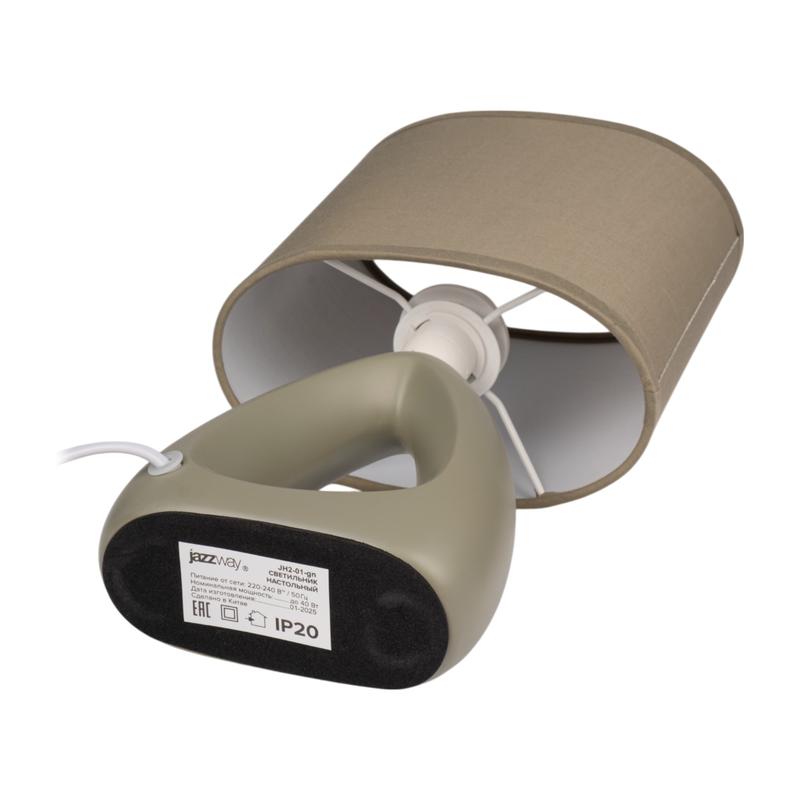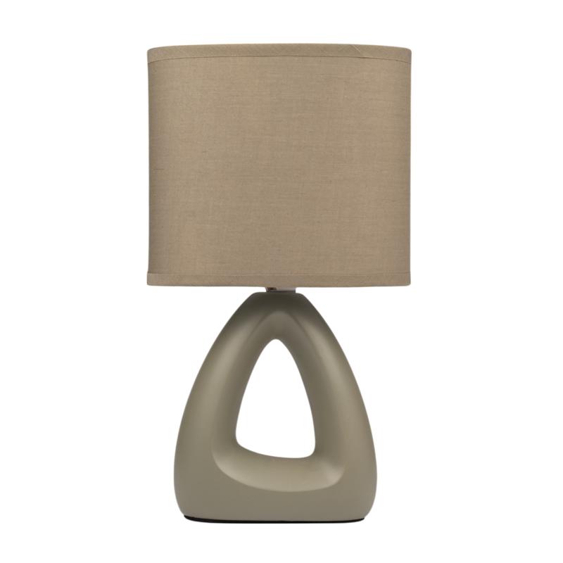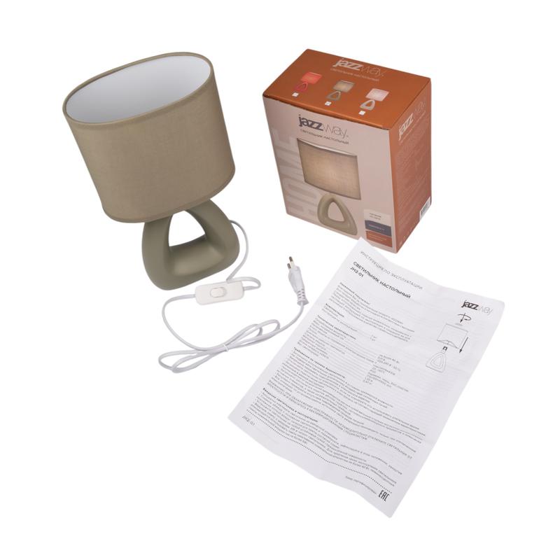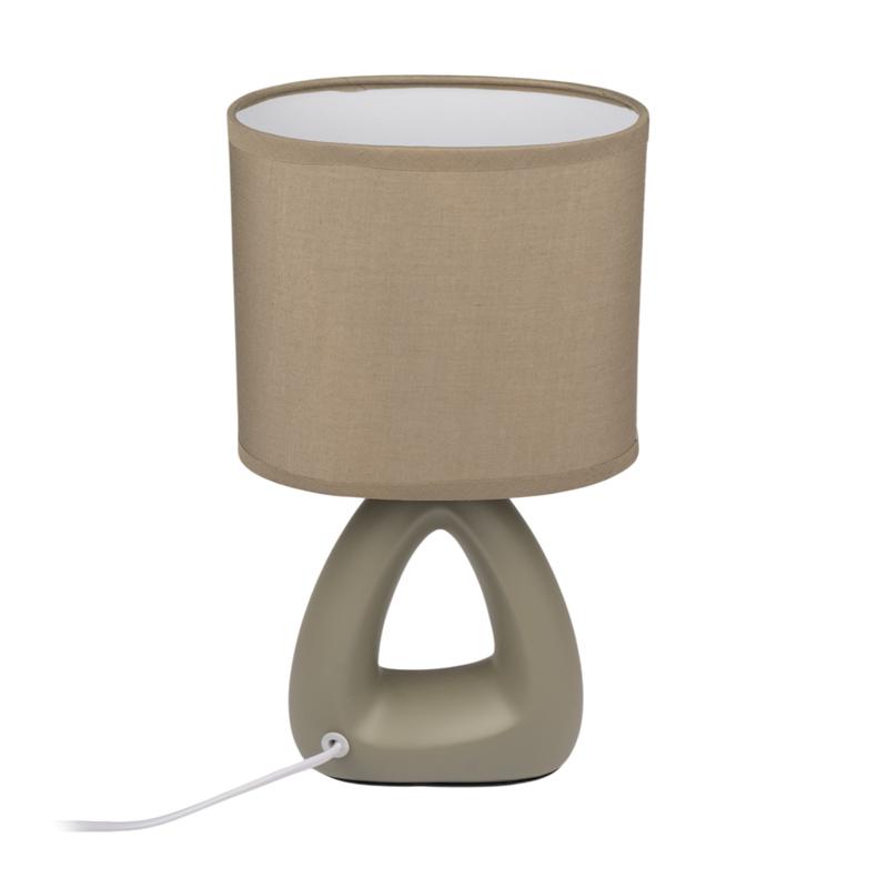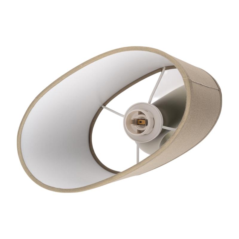 Настольный светильник с питанием от сети 220В. Материал корпуса - керамика, абажур из ткани. Цоколь Е14, может использоваться с лампами накаливания, светодиодными лампами. Длина кабеля 1,3м, выключатель на кабеле питания, цвет кабеля белый. Высота 30см, овальный абажур 17х10см.