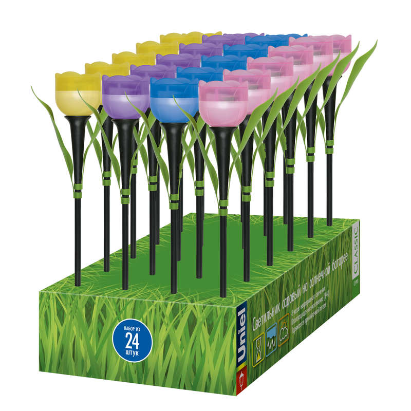 Садовые светильники на солнечной батарее USL-C-651/PT305 TULIP SET 24 в составе набора из 24 шт (4 цвета по 6 шт). Предназначены для декоративной подсветки сада - для газонов, клумб. Устанавливаются вертикально в землю с помощью пики. В светильнике используется светодиод (1 шт) , цвет свечения - белый. Срок службы - до 30000 часов. Светильник предназначен для уличной подсветки, поэтому рассчитан на работу при высоких и низких температурах. Корпус изготовлен из пластика. Степень защиты от влаги IP44. В наборе светильники 4-х цветов — розовый, желтый, фиолетовый, синий. Подключение к электросети не требуется. Встроенный аккумулятор 40 мАч, заряжается в светлое время суток с помощью солнечной панели. Полностью заряженный аккумулятор обеспечивает свечение до 8 часов. Размер изделия 305*50*50 мм (В*Д*Ш). Вес 40 гр. Гарантия 6 месяцев.