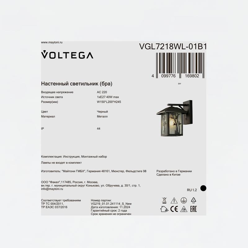Светильник настенный (бра) Saga 1х40Вт Е27 IP44 Voltega VGL7218WL-01B1 — ещё одно настенное решение из серии Saga, предназначенное для наружного использования. Его яркий свет и стильный дизайн делают его отличным выбором для оформления фасадов и садовых участков, создавая атмосферу уюта и тепла.