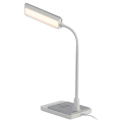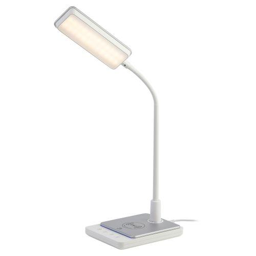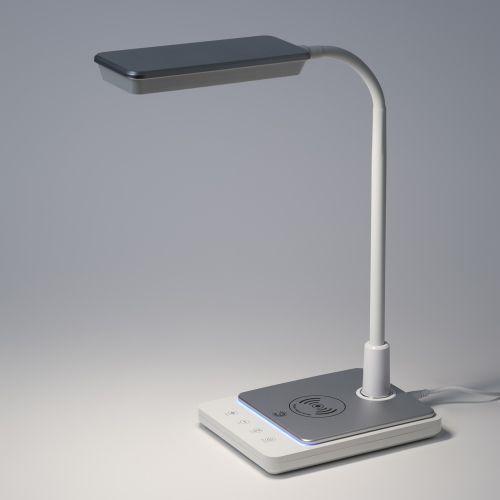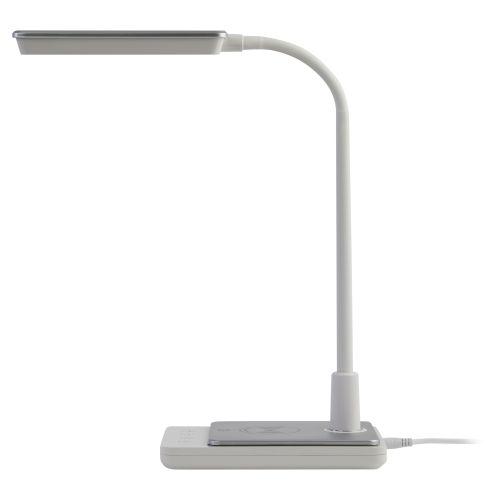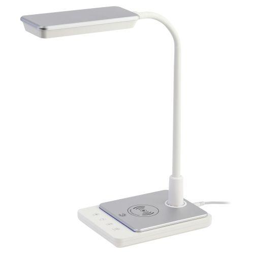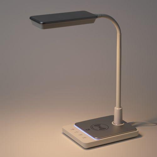 Настольный светильник ЭРА NLED-499-10W-W со светодиодами (LED) в качестве источников света. Оснащен сенсорным управлением с возможностью выбора цветовой температуры (теплый, нейтральный или холодный свет). Плавный диммер для регулировки яркости. Светильник сохраняет выбранные настройки при включении-выключении. Направление света регулируется наклоном и поворотом плафона в любом направлении. Светильник имеет встроенный модуль Qi для беспроводной зарядки мобильных устройств. Просто положите телефон, поддерживающий функцию Qi, на основание светильника в отмеченной зоне - светильник подзарядит его удобно и быстро!