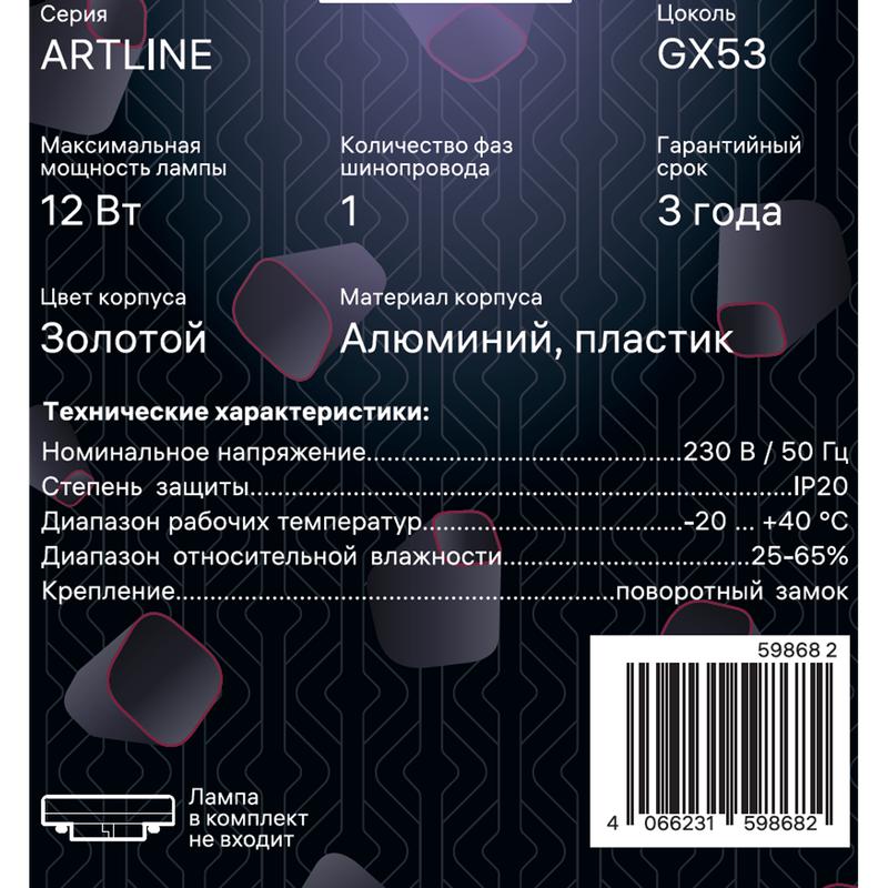Светильник трековый ARTLINE поворотный 85х85х80мм GX53 230В алюм./пластик. 4кв.м зол. Ritter 59868 2