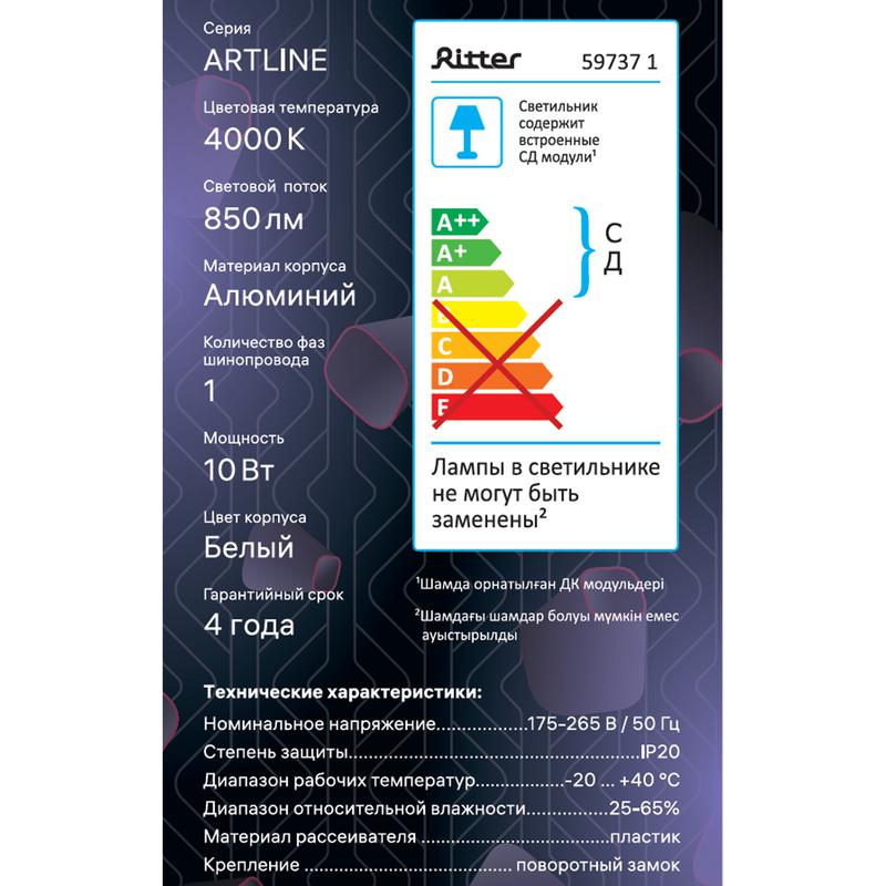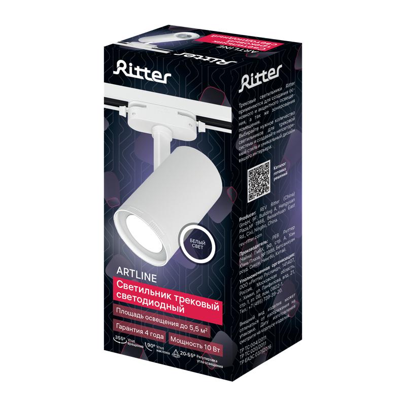 Светильник трековый светодиодный ARTLINE поворотный 57х57х135мм 10Вт 850Лм 4000К 230В алюм. 5.5кв.м бел. Ritter 59737 1