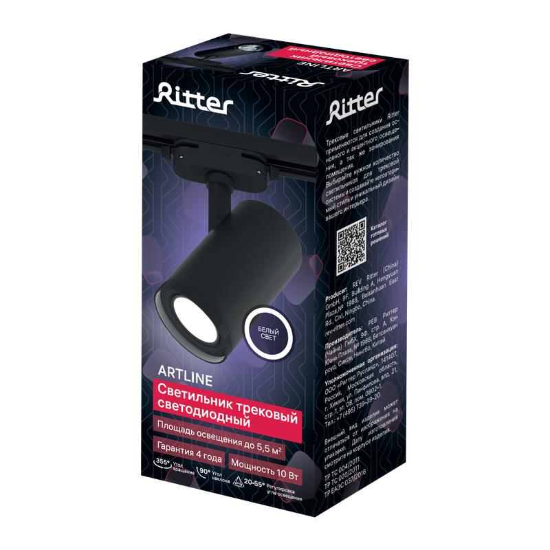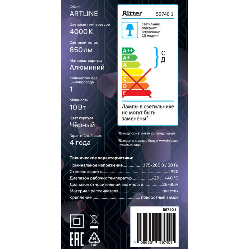 Светильник трековый светодиодный ARTLINE поворотный 57х57х135мм 10Вт 850Лм 4000К 230В алюм. 5.5кв.м черн. Ritter 59740 1