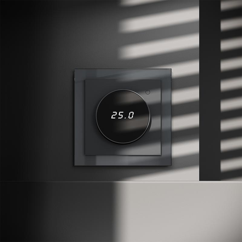 Место установки. Терморегуляторы Voltum предназначены для регулирования температуры теплого пола. Актуальны как в городских квартирах, так и в загородных дачных домах без центрального отопления. Корпус. Дизайн терморегуляторов Voltum сочетается со стилем остальных электрических устройств компании. Они совместимы со всеми рамками. Материал внешних декоративных элементов — поликарбонат. Конструктивные особенности. Терморегуляторы работают с любыми типами теплых полов и рассчитаны на нагрузку до 3500 Вт. Устройства оснащены светодиодной индикацией режима и дисплеем, на котором отображается температура поверхности пола. Красный индикатор — «подача питания на нагревательный кабель (идет процесс нагрева)», отсутствие индикации — «заданная температура достигнута». В течение 15 минут после нагрева терморегулятор переходит в интеллектуальный «спящий режим», уменьшая яркость подсветки цифр и сокращая энергопотребление. Регулировка осуществляется вращением панели управления. Терморегулятор поставляется в комплекте с механизмом из пластиковой накладки и датчиком температуры.