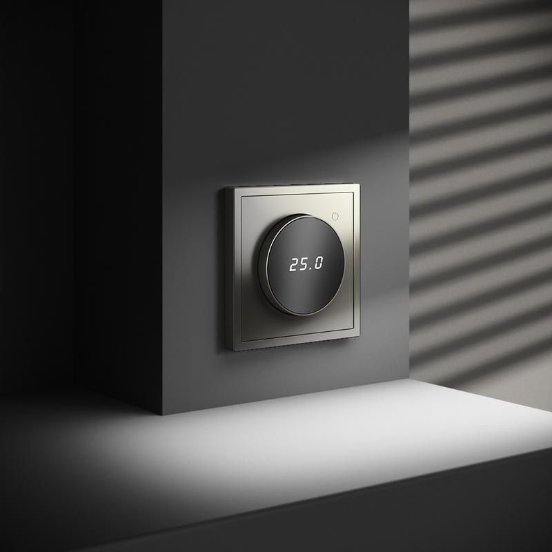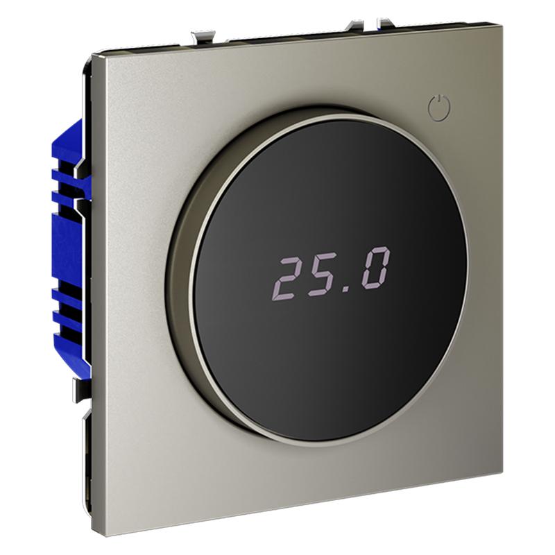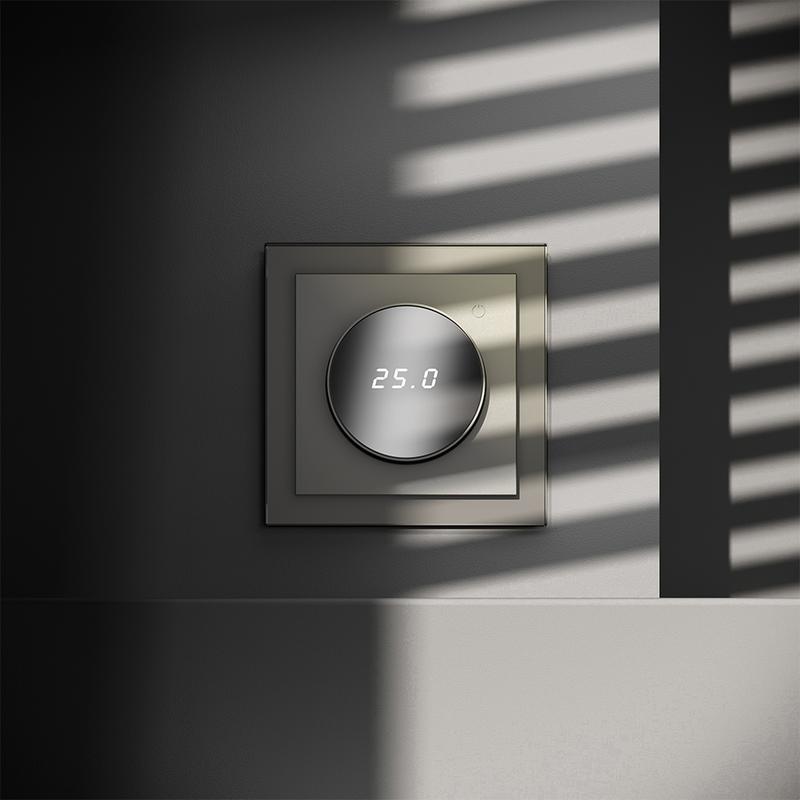 Место установки. Терморегуляторы Voltum предназначены для регулирования температуры теплого пола. Актуальны как в городских квартирах, так и в загородных дачных домах без центрального отопления. Корпус. Дизайн терморегуляторов Voltum сочетается со стилем остальных электрических устройств компании. Они совместимы со всеми рамками. Материал внешних декоративных элементов — поликарбонат. Конструктивные особенности. Терморегуляторы работают с любыми типами теплых полов и рассчитаны на нагрузку до 3500 Вт. Устройства оснащены светодиодной индикацией режима и дисплеем, на котором отображается температура поверхности пола. Красный индикатор — «подача питания на нагревательный кабель (идет процесс нагрева)», отсутствие индикации — «заданная температура достигнута». В течение 15 минут после нагрева терморегулятор переходит в интеллектуальный «спящий режим», уменьшая яркость подсветки цифр и сокращая энергопотребление. Регулировка осуществляется вращением панели управления. Терморегулятор поставляется в комплекте с механизмом из пластиковой накладки и датчиком температуры.