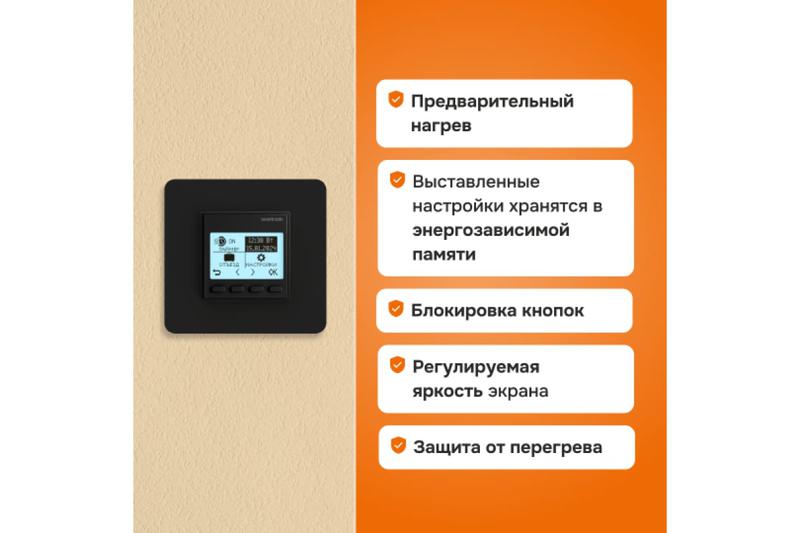 Недельный программатор экономит до 50 % на нагреве • Индивидуальная программа нагрева на неделю • Функции: Открытое окно, Отъезд, Предпрогрев • Статистика энергопотребления • Регулируемая яркость экрана • Защита от перегрева