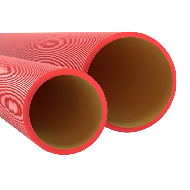 Двустенные жесткие трубы предназначены строго для скрытой прокладки: в грунте или в монолите строений. Трубы выдерживают значительные нагрузки, а потому могут использоваться даже в зонах с высокими нагрузками (например, на участках, предназначенных для проезда автотранспорта). Трубы надежно защищают кабель от любых внешних воздействий. Жесткая двустенная труба для кабельной канализации имеет диаметр 200 мм. Кольцевая жесткость (SN) 8 кПа. Поставляется отрезками по 6 метров. К каждому отрезку в комплекте идет соединительная муфта. Материал - ПНД. Цвет внешней стенки - красный.