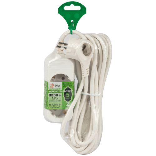 Удлинитель электрический Эра GREENLINE UDL-16-250-E с заземлением, на 2 розетки, провод 5м ПВС 3x1мм2. Рассчитан на максимальную мощность 16А/3500 Вт. Удлинитель станет Вашим надежным помощником, если любимые электроприборы находятся далеко от розеток. Корпус выполнен из ударопрочного и негорючего пластика (полипропилен). Вилка обеспечена кольцом для удобного извлечения ее из розетки. Модель удлинителя на 16А позволяет подключить бытовые приборы общей нагрузкой до 3500Вт.