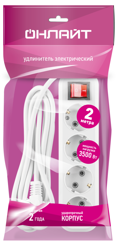 Удлинитель 4х2м с заземл. 16А IP20 90 808 OPE-S-04-200-ESC-3x1 с кнопкой бел. ОНЛАЙТ 90808