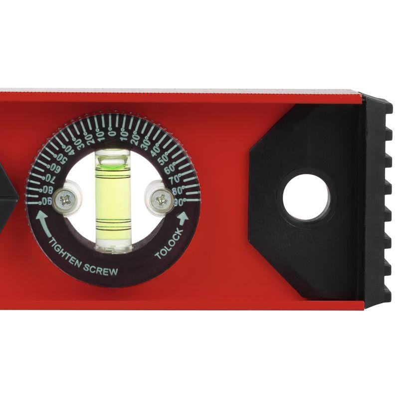 Модель оснащена тремя пузырьковыми глазками для проверки отклонений по горизонтали и вертикали. Один из глазков – поворотный, что позволяет использовать уровень для выставления произвольных углов.