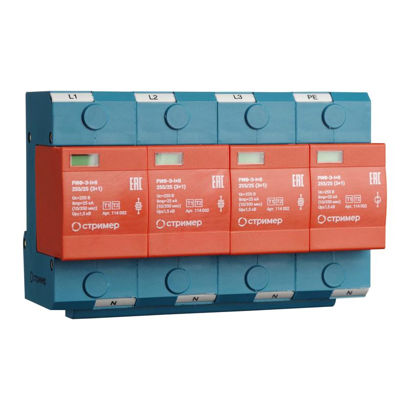 Мощное четыреполюсное УЗИП класса I+II коммутирующего типа со сменными рабочими модулями на основе искровых промежутков и газонаполненного разрядника. УЗИП предназначено для защиты оборудования в низковольтных цепях до 1000 В от прямых и отдаленных молниевых разрядов при воздушном или кабельном вводах электропитания.