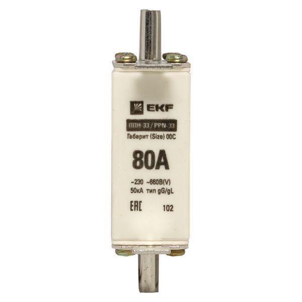 Плавкая вставка ППН-33 100/ 80А габарит 00С EKF. Предохранители плавкие ППН EKF, укомплектованные плавкими вставками типа gG/gL, предназначаются для защиты кабельных линий и промышленных электроустановок от токов перегрузки и короткого замыкания. Предохранители применяются в электрических сетях переменного тока частотой 50 Гц с напряжением до 660В. Применяются для крепления в распределительных и вводно-распределительных устройствах. Предохранители плавкие ППН могут устанавливаться в основание с держателем, а также в специально предназначенные рубильники. В комплект поставки предохранителей плавких ППН основание с держателем не входит и приобретается отдельно.