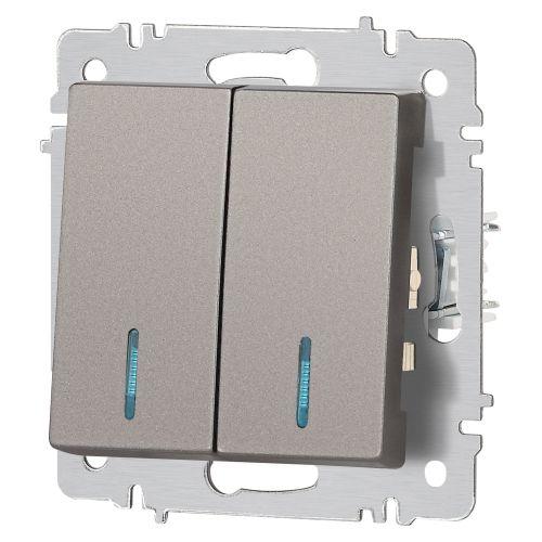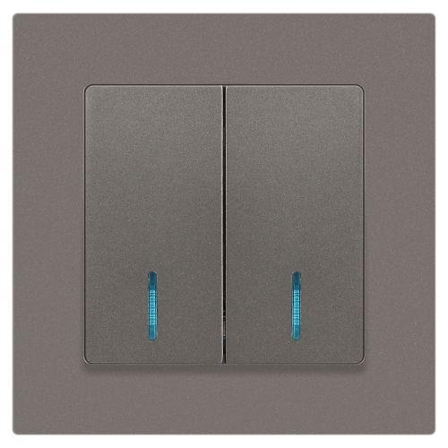 Выключатель 2-клавишный с подсветкой серии Intro Accent скрытой установки механизм цвет титан 6-105-09. Номинальные характеристики 10А 250В. Выполнен из негорючего термопласта, оснащён винтовыми клеммами. Парные клеммы обеспечивают соединение шлейфом. Монтаж в подрозетник производится и на лапки, и на винты. Рамка приобретается отдельно. В серии представлены рамки до 5 постов: на 1 пост - 6-501-хх, на 2 поста - 6-502-хх, на 3 поста - 6-503-хх, на 6 поста - 4-504-хх, на 5 постов - 6-505-хх (где хх - цветовой код: 01 - белый, 01М - матовый белый, 02 - слоновая кость, 03 - алюминий, 04 - шампань, 05 - антрацит, 06 - перламутр, 07 - графит, 08 - бронза, 09 - титан, 10 - венге, 11 - сосна)