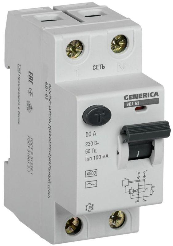 Выключатель дифференциального тока (УЗО) 2п 50А 100мА тип AC ВД1-63 GENERICA MDV15-2-050-100